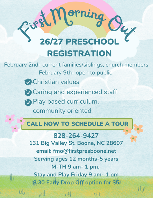 First Morning Out is an early childhood program sponsored by First Presbyterian Church of Boone. It is a ministry to families in our congregation as well as in the greater community. This outreach is an expression of God’s love through Jesus Christ!