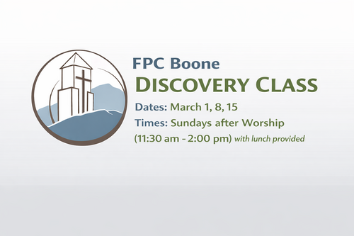 Interested in getting more involved at FPC Boone? Join us for the Discovery Class on Sundays, March 1, 8, and 15th, right after worship. For those desiring to join, Membership Sunday will be held on March 22.